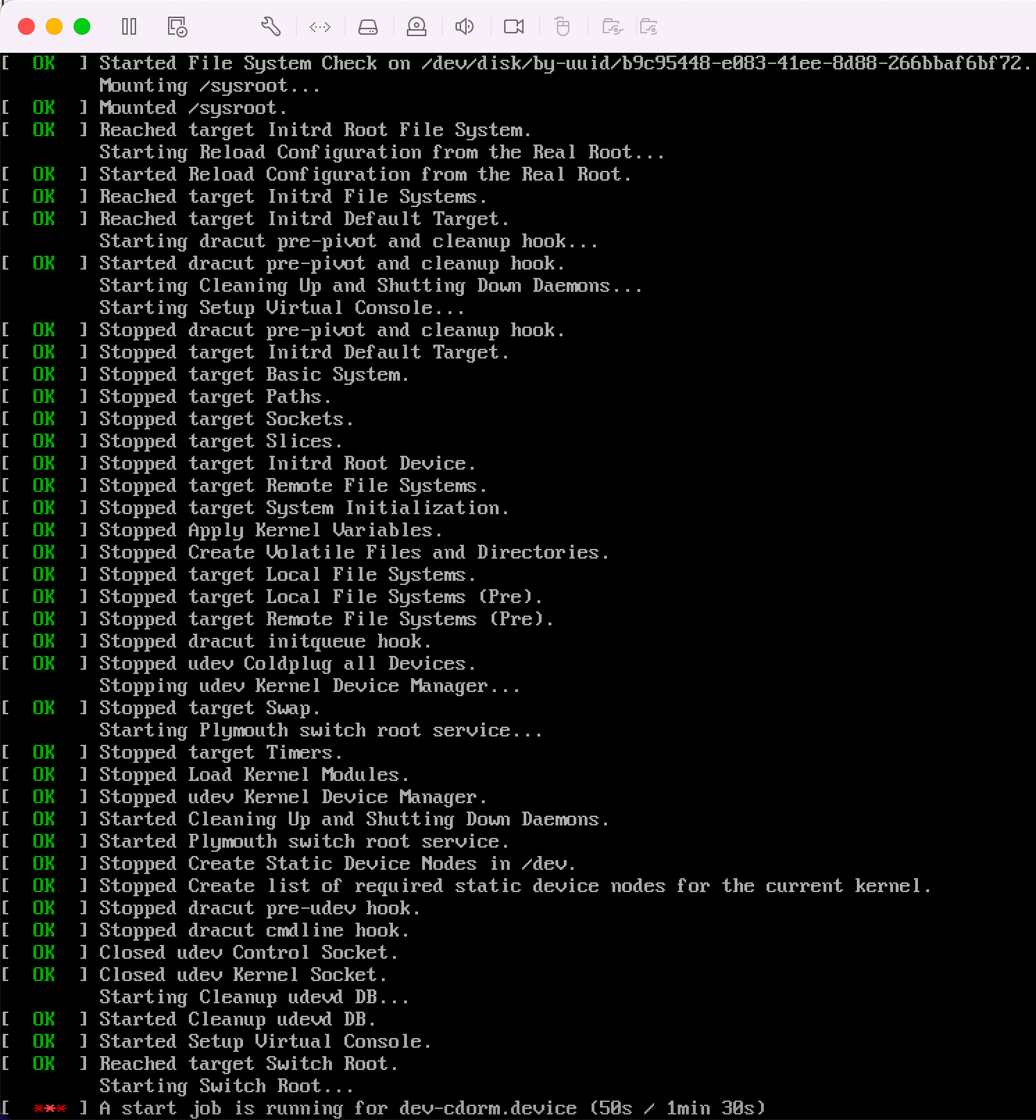 按esc可以进入字符加载界面,可以看到系统在加载一个错误的服务进行超时等待