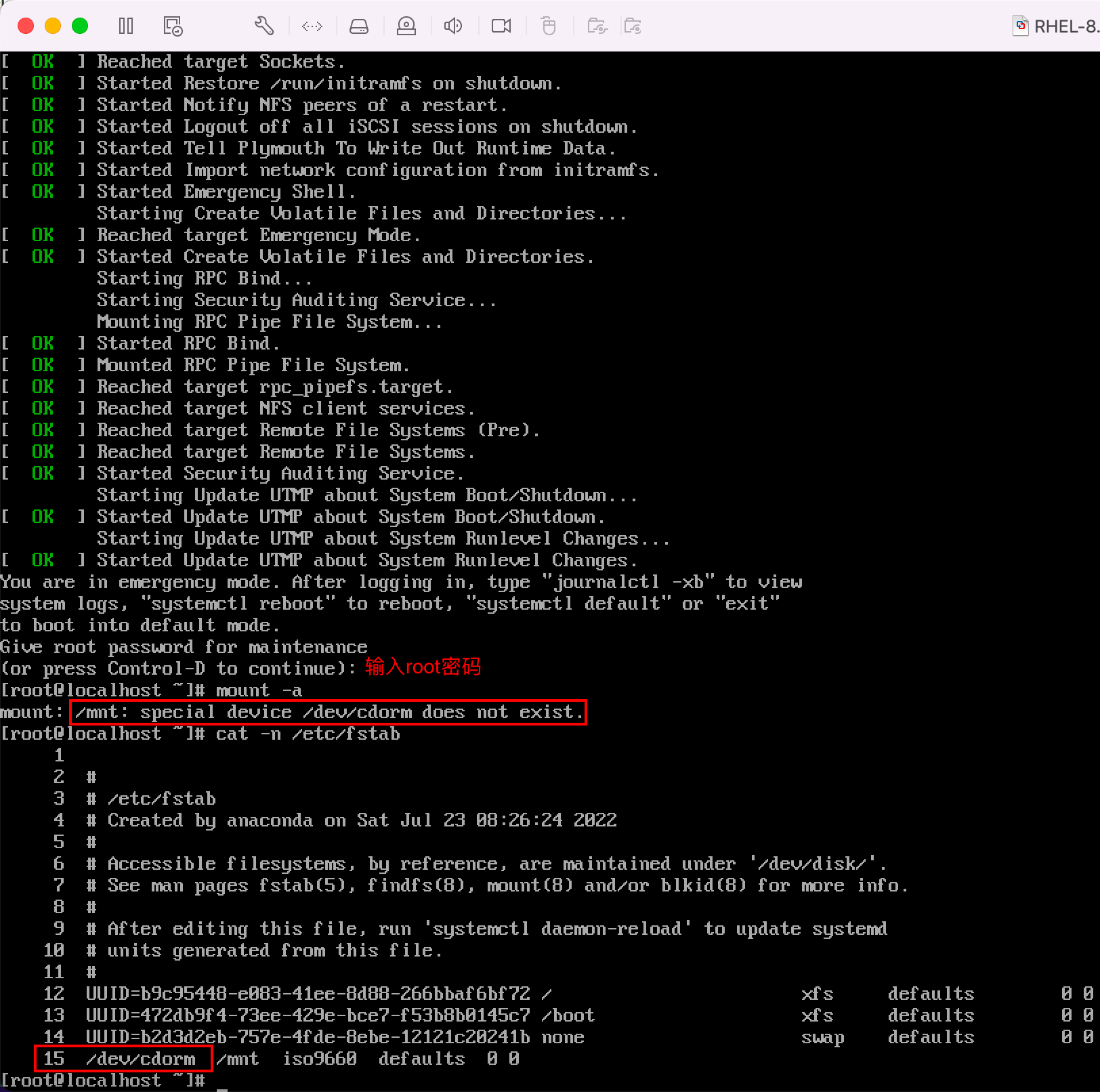 超时完成之后进入到紧急修复模式,直接输入root密码进入系统