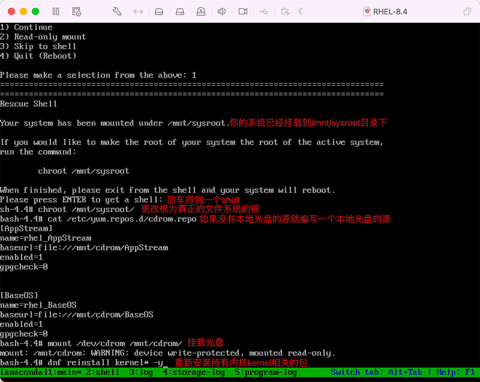 重启之后,因为grub的配置文件,grub引导程序要执行的文件都找不到,所以进入到了grub救援模式,因为整个/boot目录都没了,所以需要从光盘进入救援模式去修复
