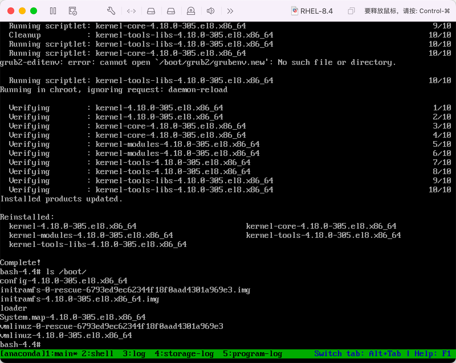 然后yum/dnf reinstall kernel* -y 安装时间可能很长,需要等待一会,安装完成就看到/boot目录下内核相关的文件已经恢复了 此时还缺少grub引导程序要执行的文件,grub启动菜单
